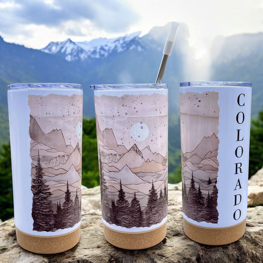 Watercolor Vintage Mountainscape 17 oz Stainless Steel Tumbler with Metal Straw and Silicone Topper