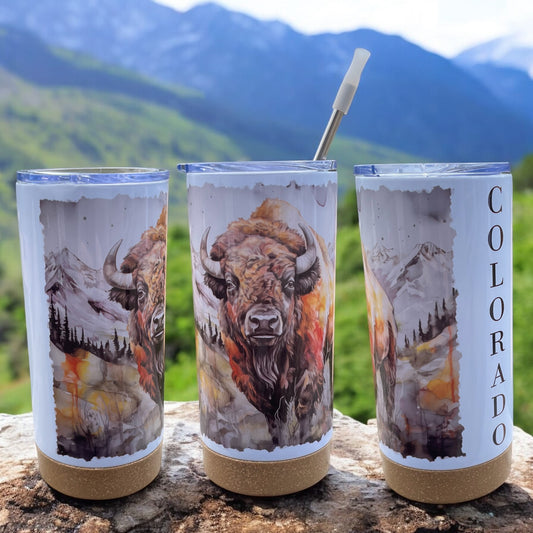 Watercolor Bison 17 oz Stainless Steel Tumbler with Metal Straw and Silicone Topper