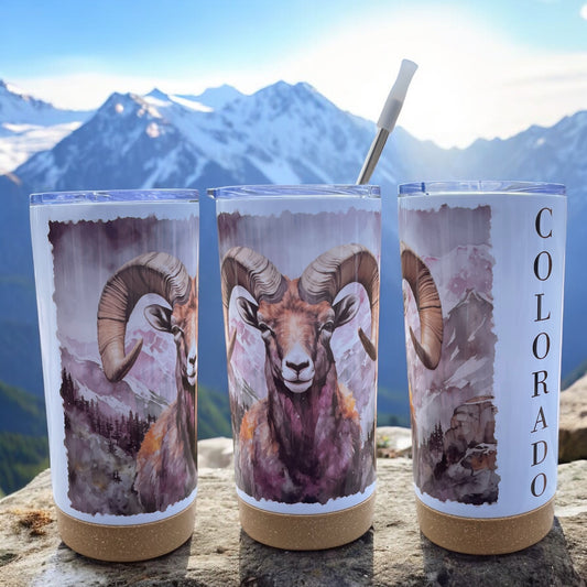 Watercolor Bighorn Sheep 17 oz Stainless Steel Tumbler with Metal Straw and Silicone Topper